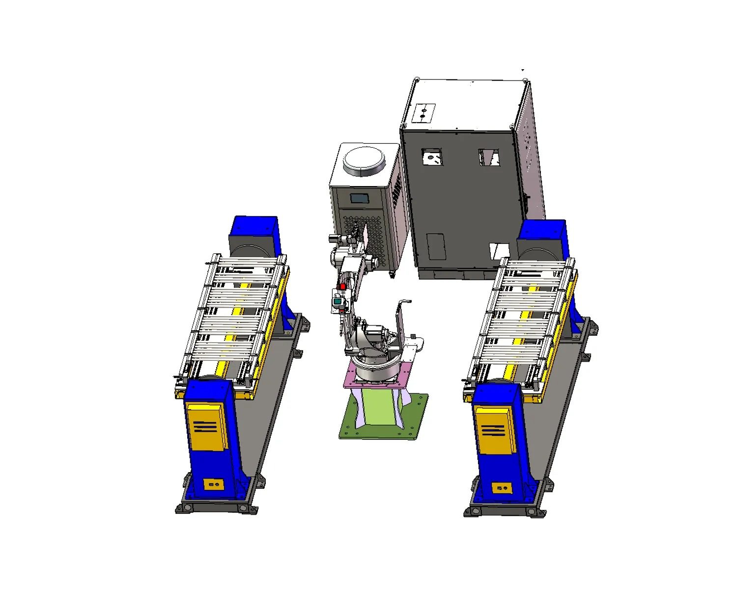 The solution integrates core equipment such as an electrical control cabinet, laser welding head, industrial robot, dual positioners, and water chiller. Among them, V-shaped blocks are used for positioning round pipes and U-shaped blocks for square pipes, ensuring precise fixation of different pipes and stable welding processes.
